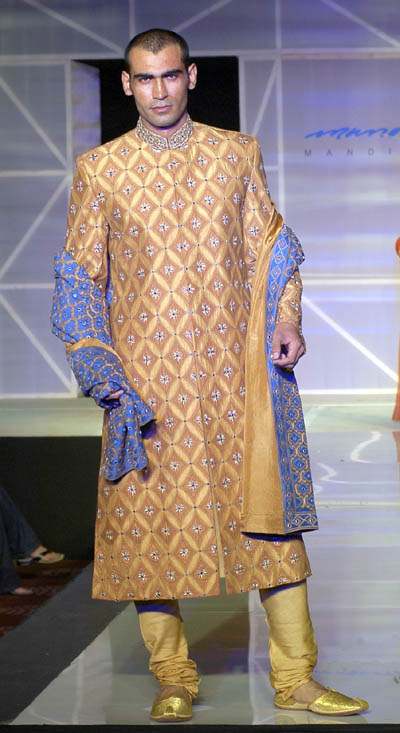 Burnt Orange Groom's SherwaniStyle Number : MN06-01Orange and brown silk mirror sherwani fully embroidered with silk embroidered shawl.