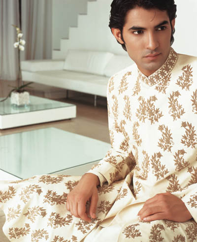 Off-white SherwaniStyle Number : MN04-04Off-white silk paisley design fully embroidered sherwani.